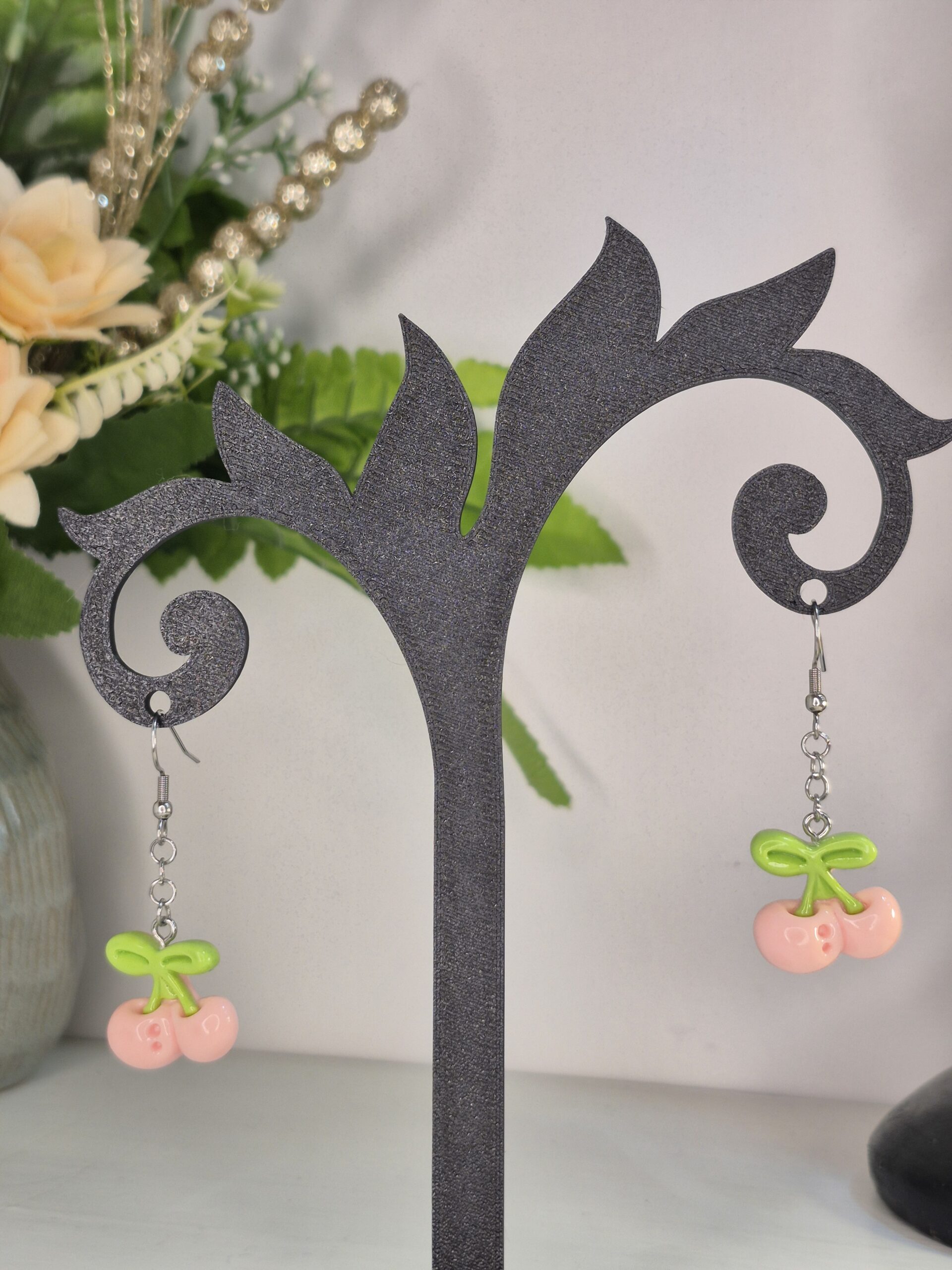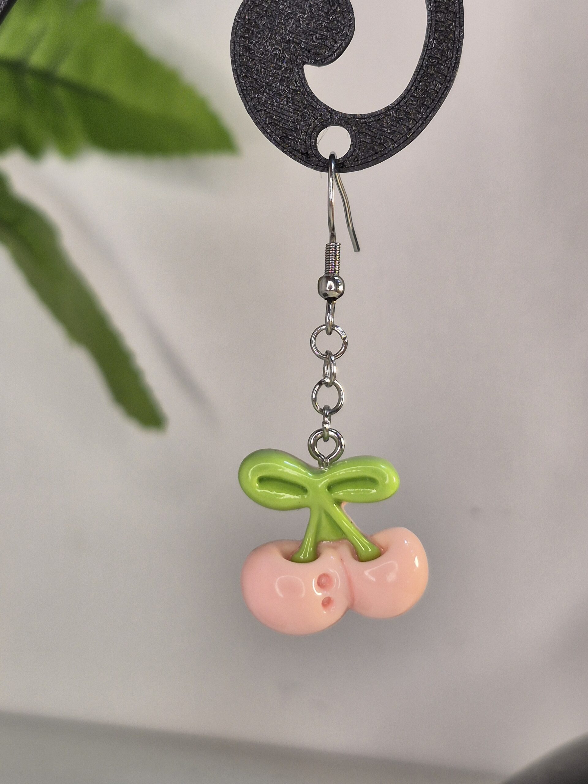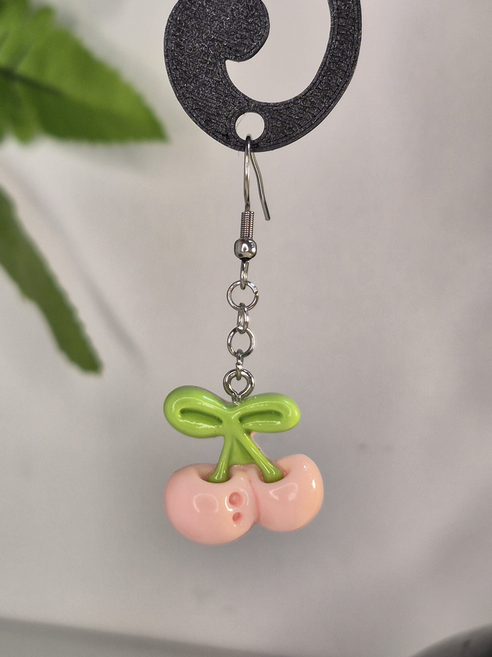 Aritos Cereza Rosas. Charm de cerezas rosadas pastel con moño verde. Delicados, kawaii y perfectos para looks cute y coloridos. Estilo DokiDoom.