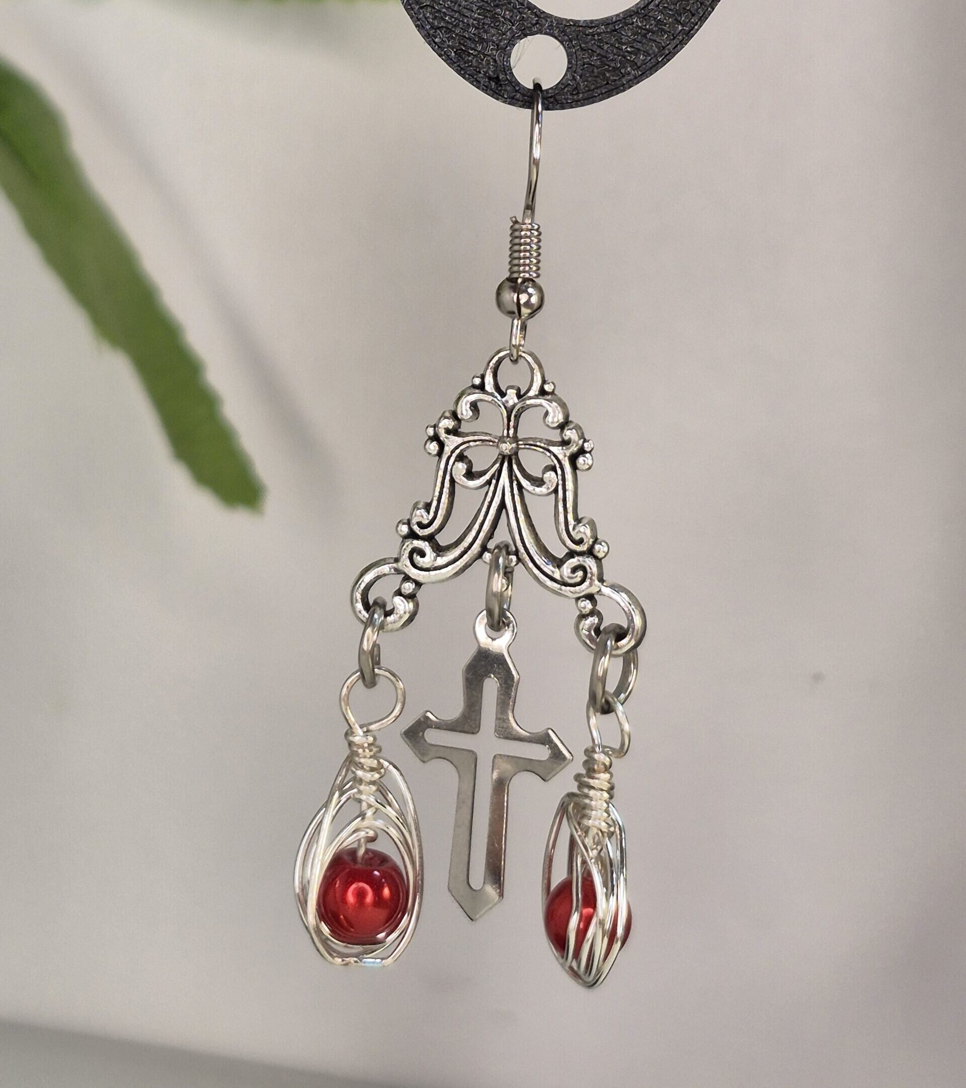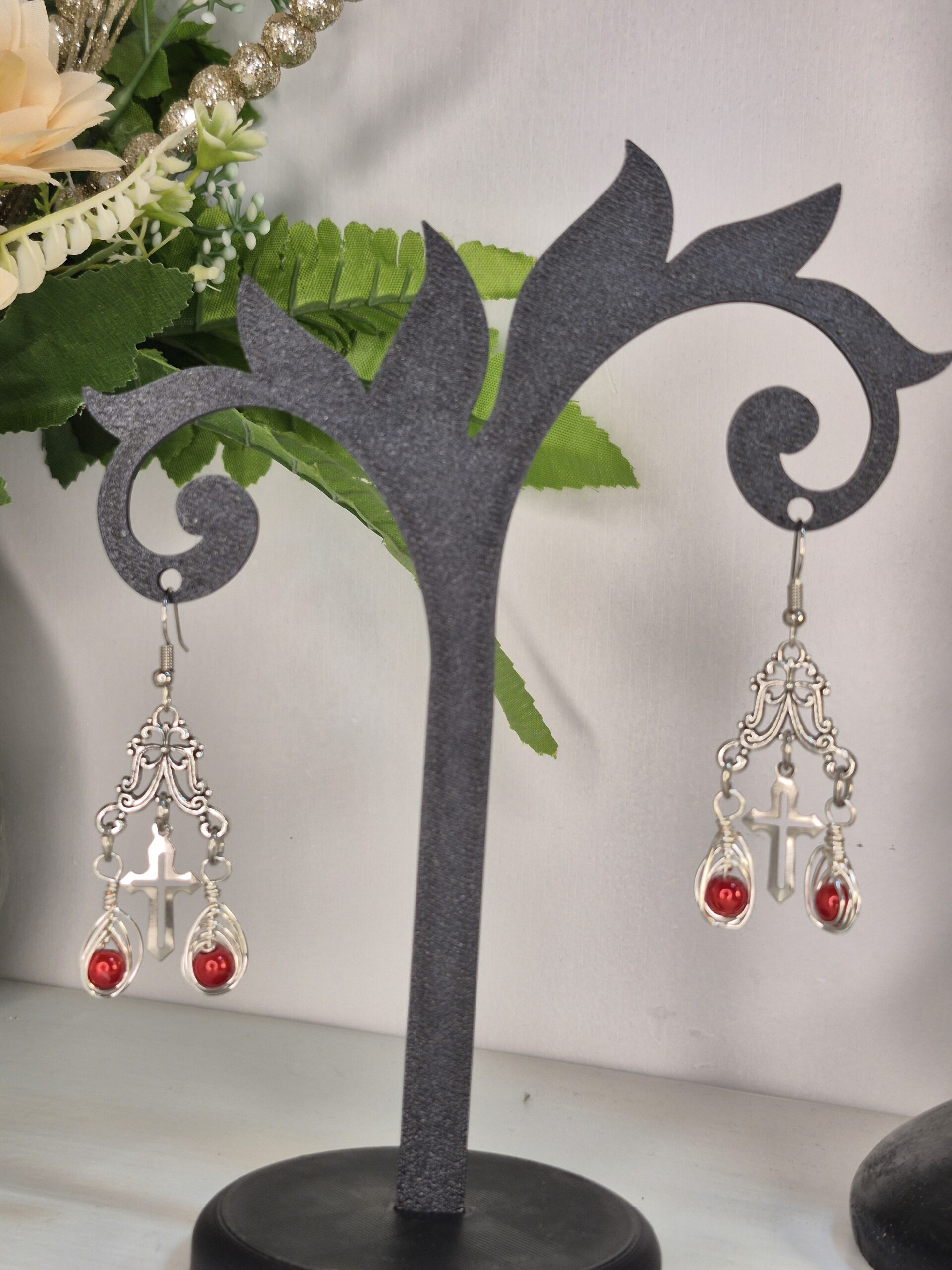 Aritos Dark Cathedral. Inspirados en arquitectura gótica con cruz metálica y lágrimas rojas encapsuladas. Dramáticos, vampíricos y perfectos para looks dark y alternativos. Estilo DokiDoom.