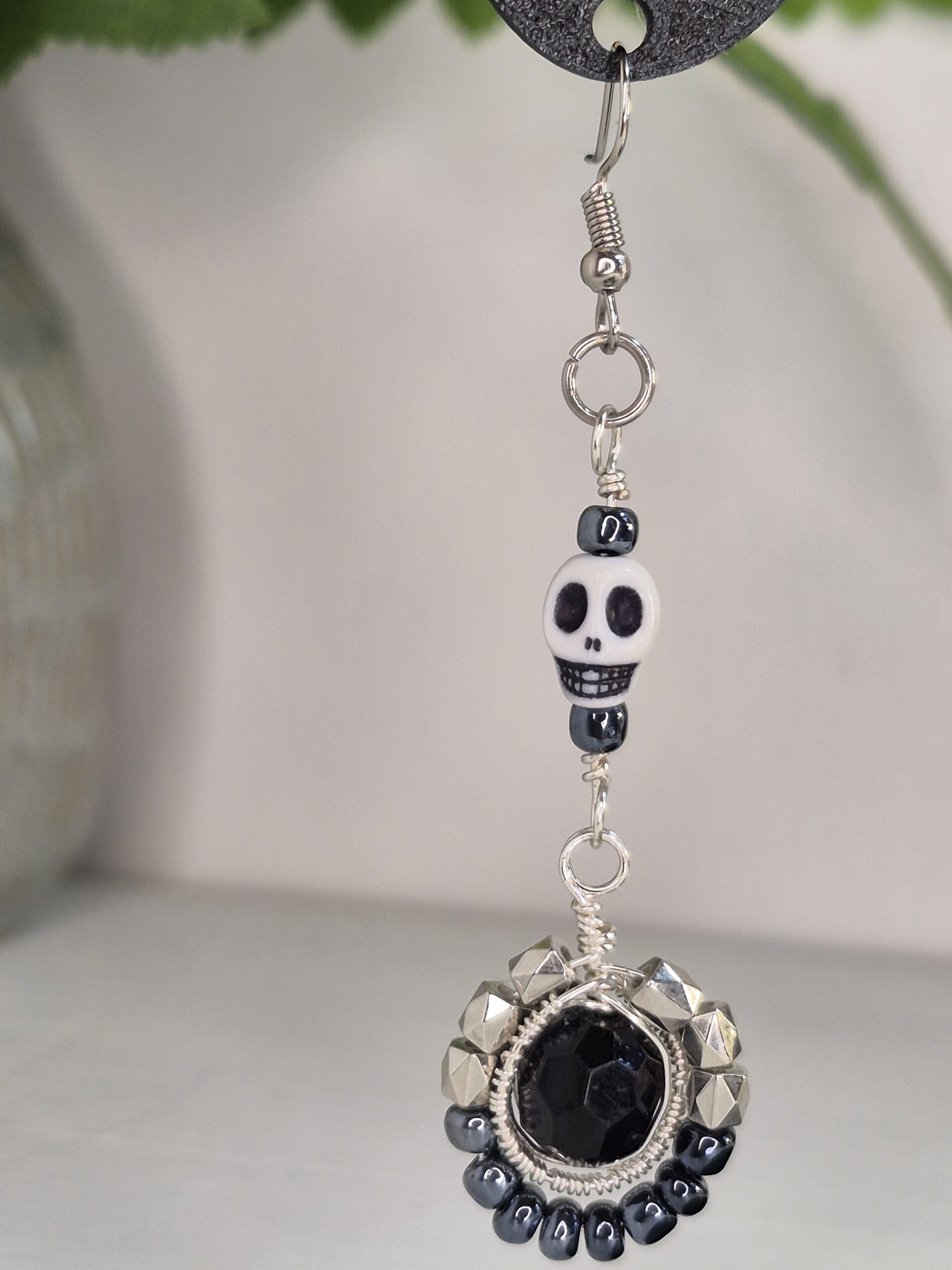 Aritos góticos artesanales con calavera y centro negro facetado.