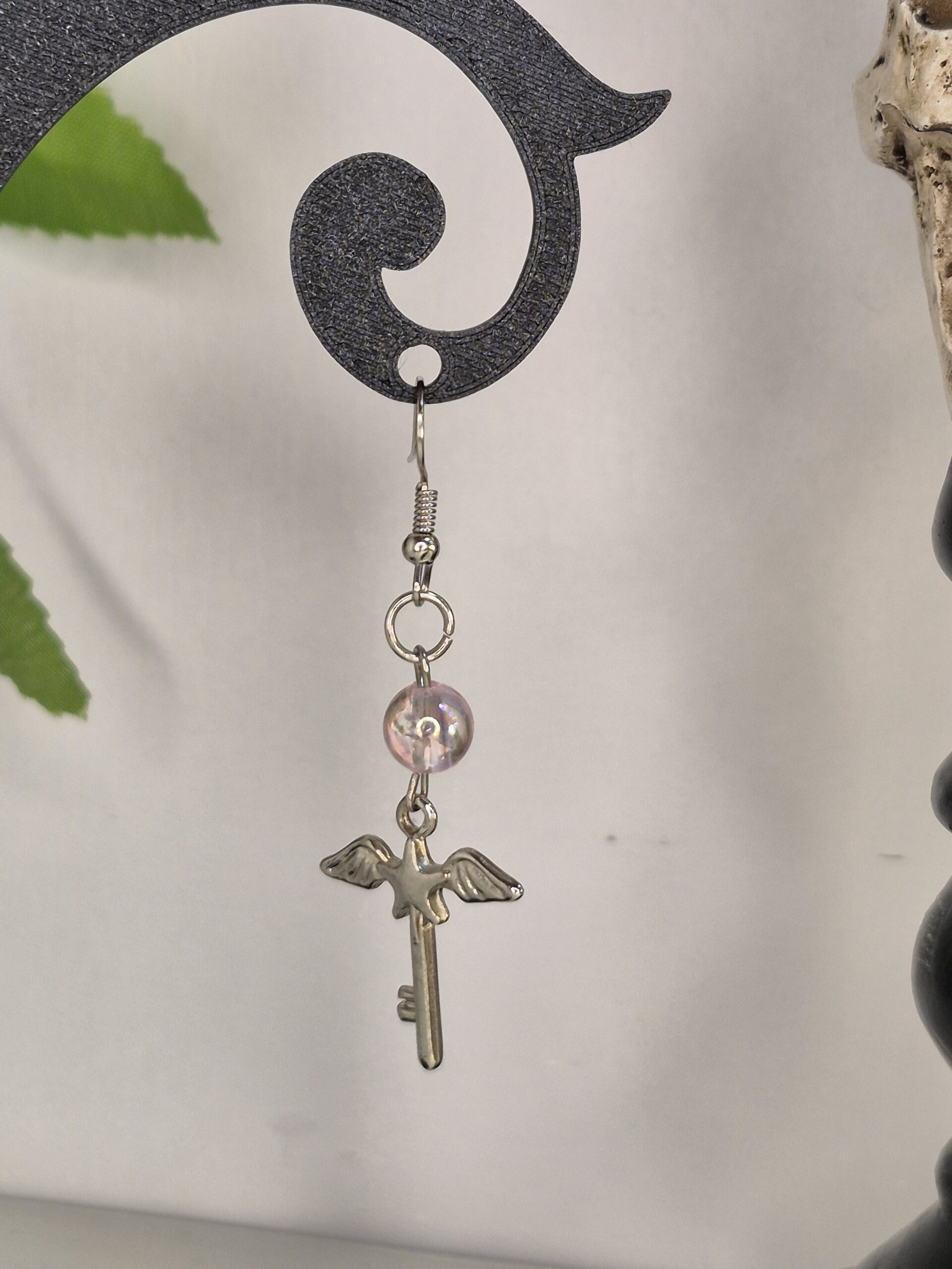Aritos con perlita rosa iridiscente y charm de llave alada. Delicados y mágicos.