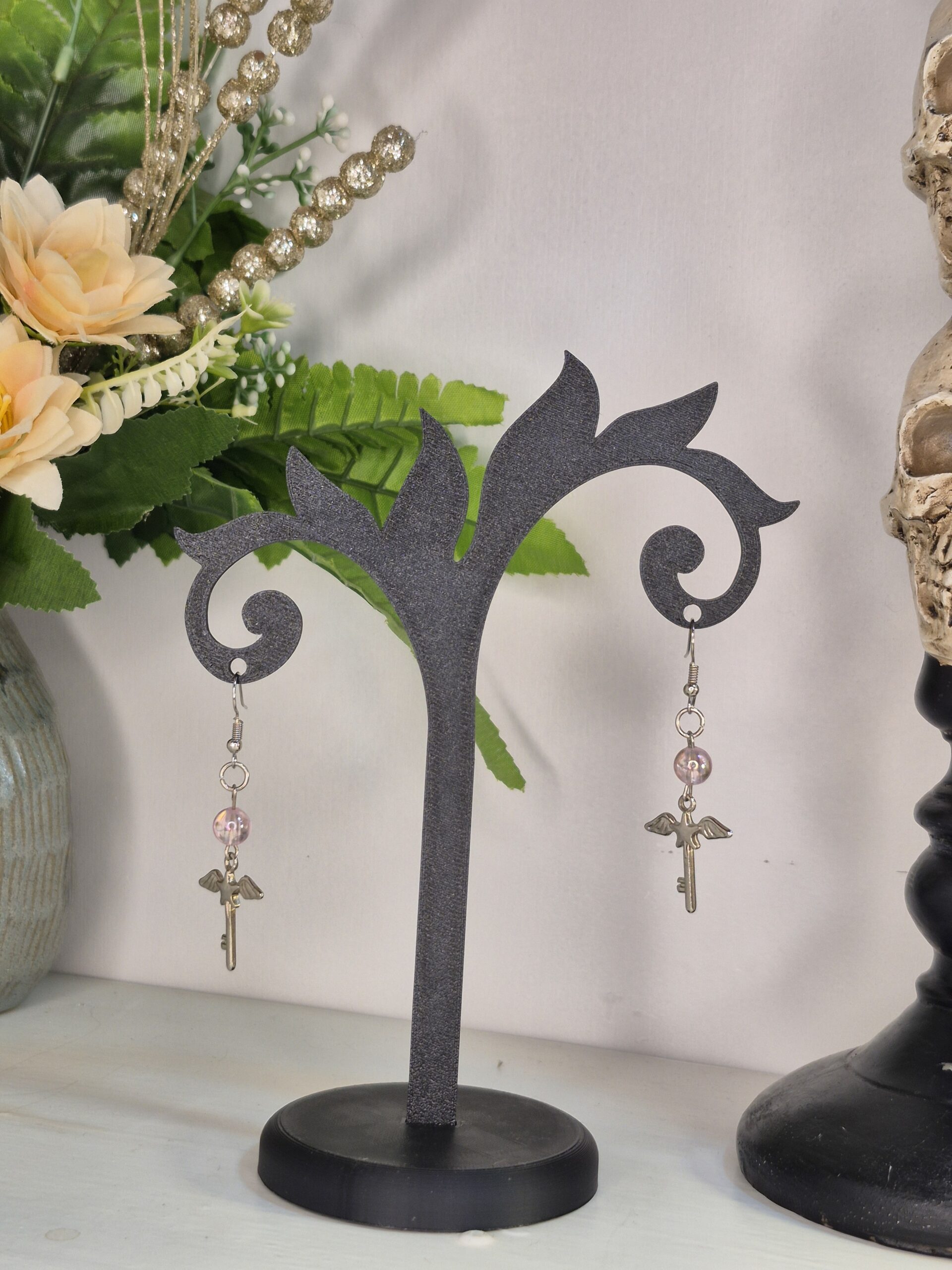 Aritos Sakura. Un diseño delicado con perlita rosada iridiscente y llave alada metálica estilo fantasy. Livianos, kawaii y mágicos, ideales para looks cute & creepy con un toque angelical. DokiDoom.