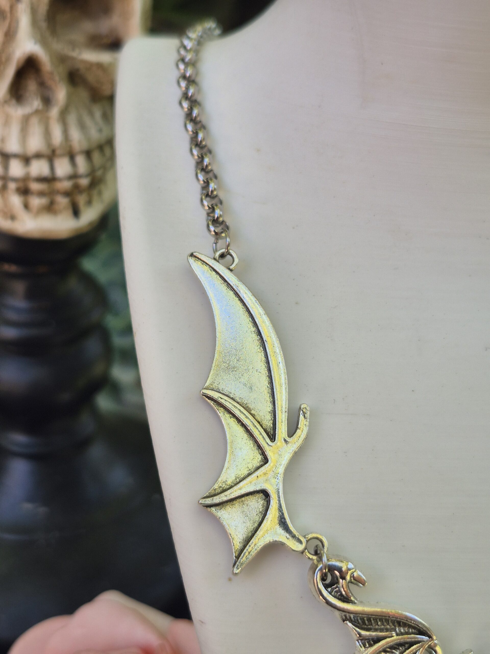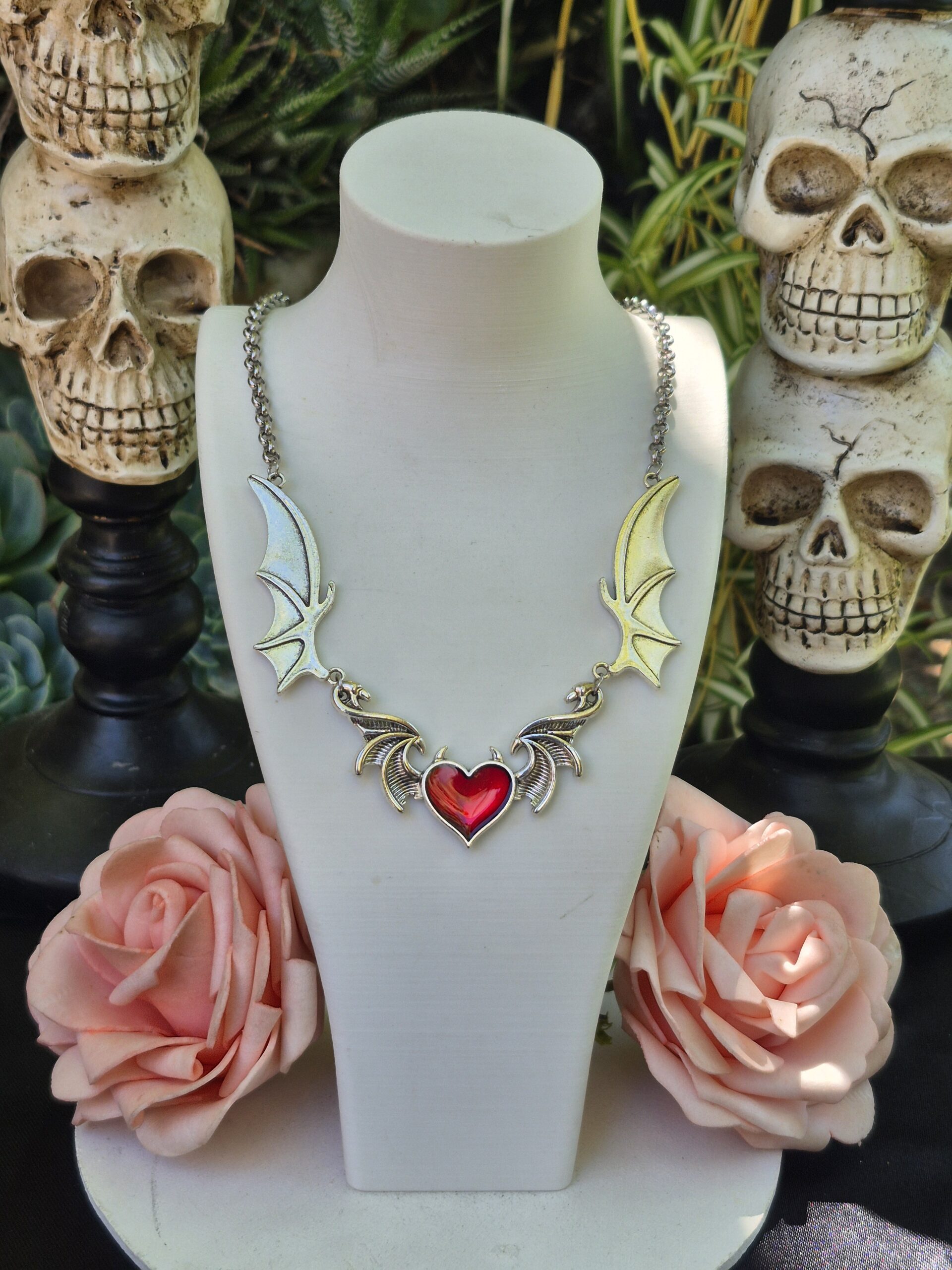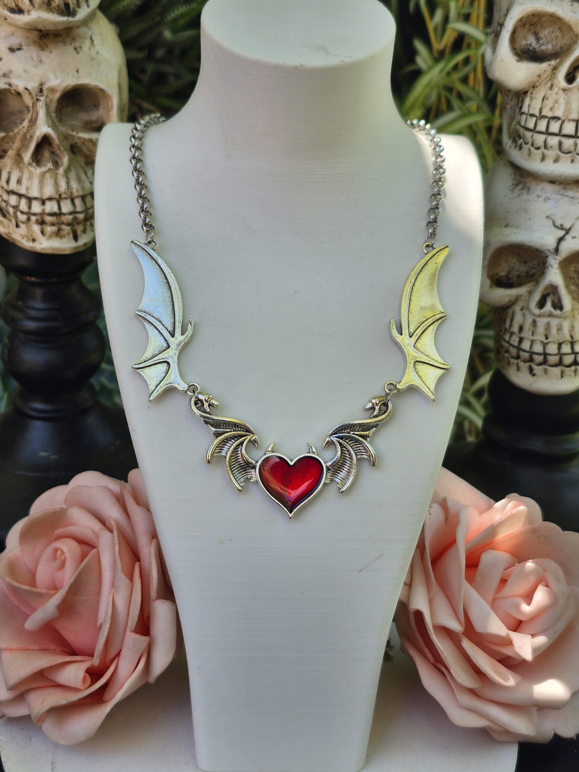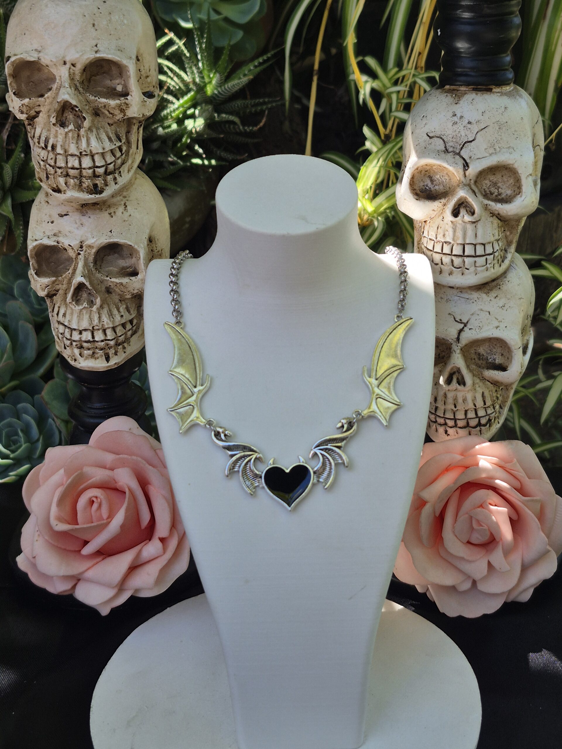 Libera tu encanto oscuro con este impactante collar de corazón de vampiro, con alas de murciélago plateadas de intrincada elaboración que envuelven delicadamente un corazón audaz y romántico. Perfecto para amantes de la moda gótica, alternativa y con estilo, este collar añade un encanto encantador y misterioso a cualquier look. Es el regalo ideal para ti o para alguien que abraza el lado más oscuro de la elegancia.