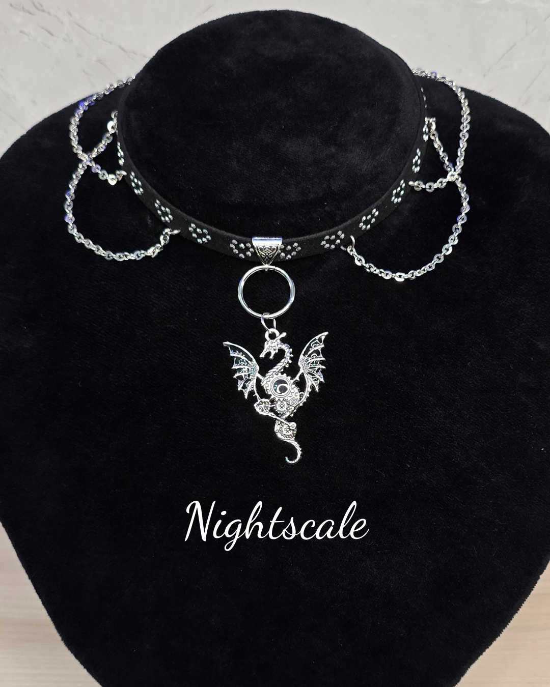 l collar Nightscale está inspirado en criaturas legendarias y guardianes de la noche. Su diseño combina una cinta de gamuza negra decorada con delicados detalles metálicos y cadenas laterales, realzadas por un colgante de dragón plateado que simboliza poder, sabiduría y protección.