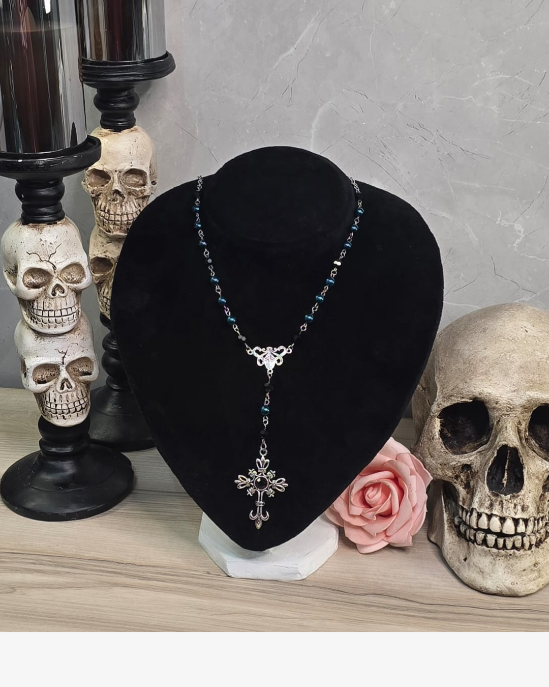 Diseñado artesanalmente, presenta una delicada combinación de cuentas de vidrio verdes y negras facetadas, que aportan brillo y contraste, acompañadas por un dije de cruz en aleación metálica con detalles intrincados.