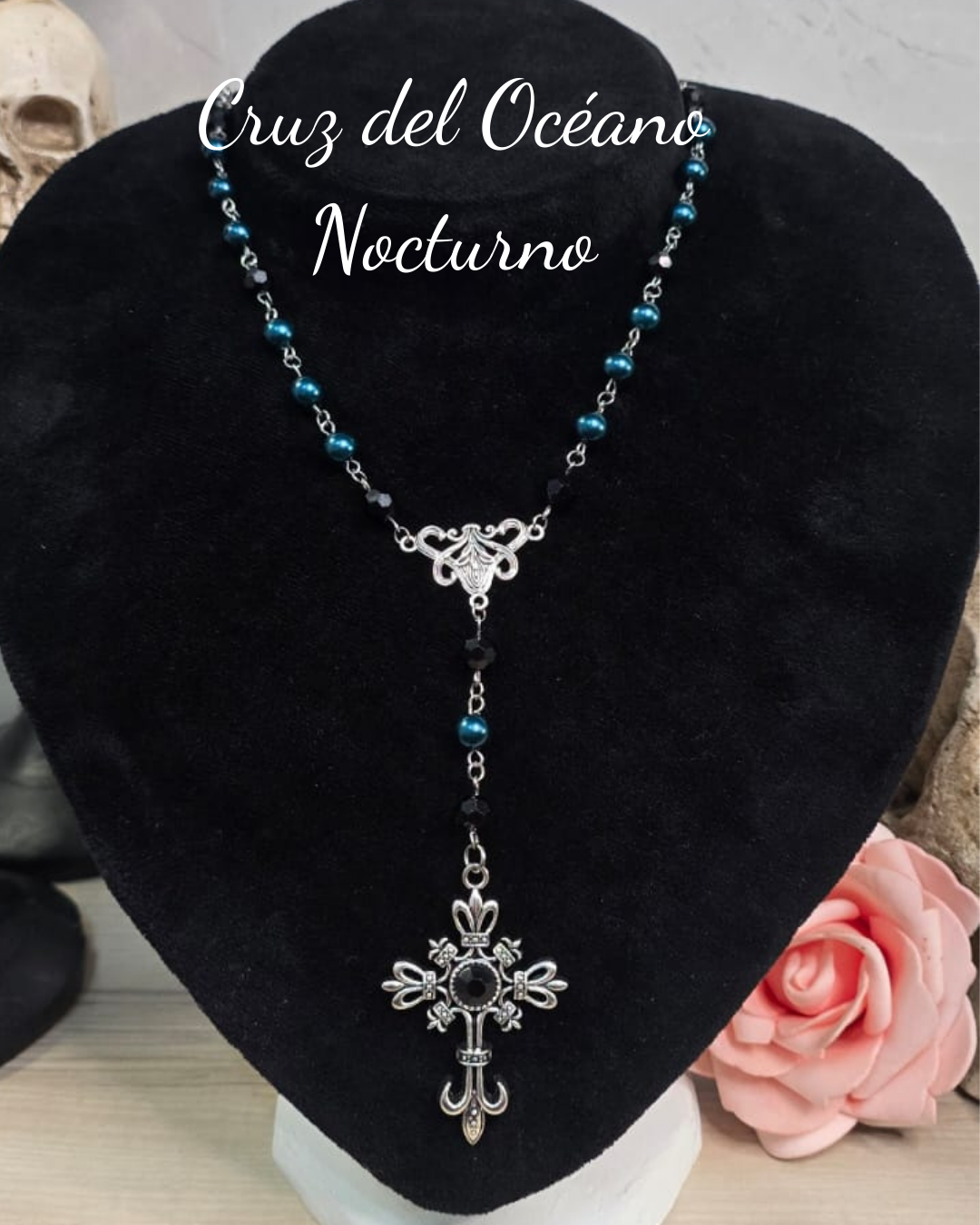 El collar Cruz del Océano Nocturno evoca la calma y el poder del mar bajo la luz de la luna.